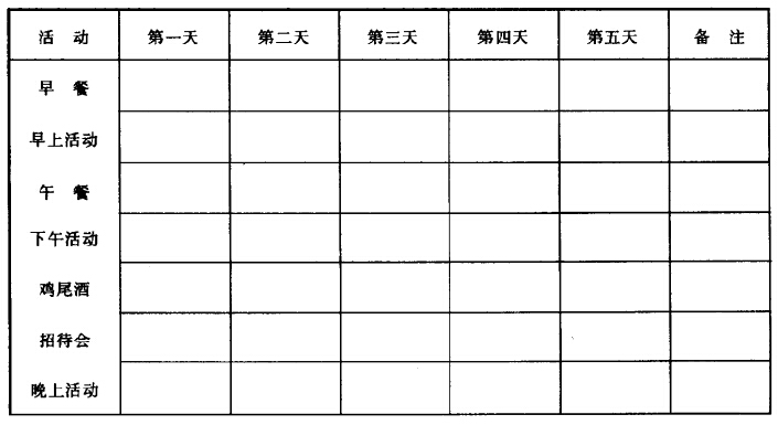 想象一下活動(dòng)的整個(gè)過(guò)程,以便確定對(duì)時(shí)間和空間方面的要求(包括預(yù)留出活動(dòng)初期的布置時(shí)間和活動(dòng)結(jié)束時(shí)的拆卸時(shí)間)。了解一下需要哪些物品,并開(kāi)始準(zhǔn)備成本表。成本表要做到具體明確。如果你需要天花板有6米高才放得下視聽(tīng)設(shè)備和舞臺(tái)布景材料,你就應(yīng)該在表格里清楚地注明。你還必須安排提前布置和排練的空間。如果你需要將會(huì)議廳提前預(yù)訂24個(gè)小時(shí),以便你所設(shè)置的布景能保留到活動(dòng)開(kāi)始的那天,那你也要把這些要求清楚地寫(xiě)在表格里。如果你需要為演員準(zhǔn)備一個(gè)化妝間,為員工準(zhǔn)備辦公室或?yàn)闇?zhǔn)備或擺放陳列品安排一個(gè)區(qū)域,那么一定要將你的一切需要告知場(chǎng)地管理部門(mén)。合同簽訂后,減少多余安排的空間比千方百計(jì)解決空間不足的問(wèn)題要容易得多。