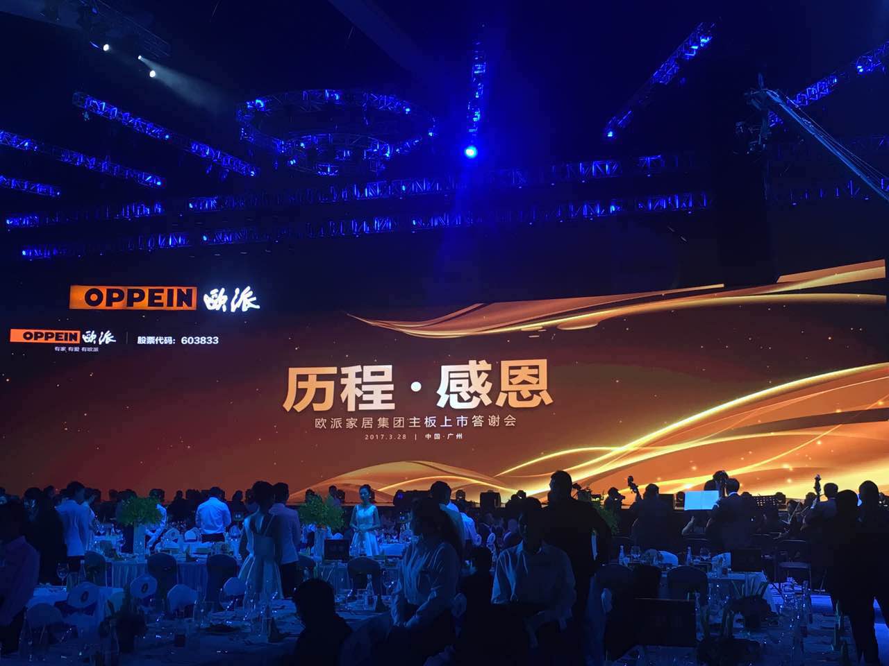 3月28日,歐派家居集團主板上市答謝慶典在廣州體育館旅行。晚宴邀請了汪峰、沙寶亮、毛阿敏等知名歌手演唱,現(xiàn)場還有交響音樂會,共同奏響歐派上市新歷程。