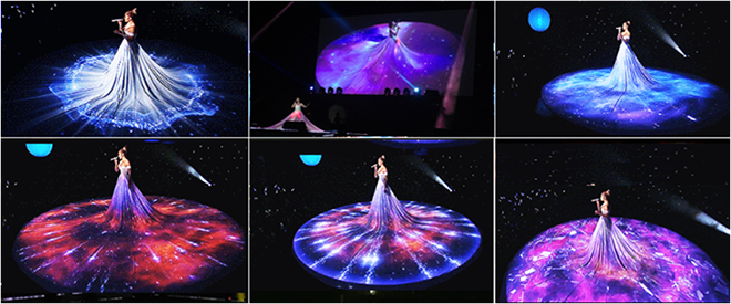 歌手身穿潔白巨型拖地長裙,在巨大的舞臺(tái),運(yùn)用全息投影技術(shù),結(jié)合現(xiàn)場光、影與音樂的完美映襯下,變幻出閃耀著五彩繽紛、絢爛奪目的特效裙子。讓演唱者散發(fā)出一種誘人魅力!宛如灰姑娘的魔法之神與宇宙、星辰、云彩之中,舞臺(tái)演出效果絕對經(jīng)驗(yàn)全場!