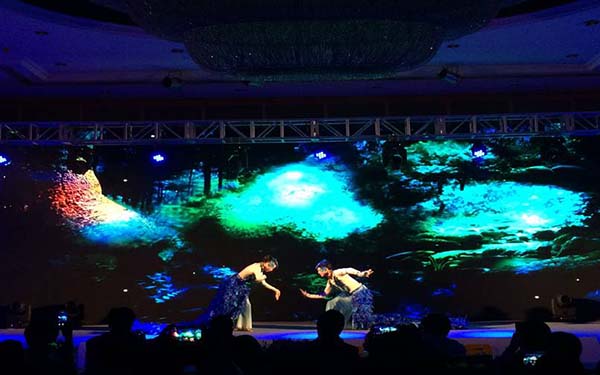 以神秘艷麗的深藍(lán)幻境森林為大環(huán)境視頻,畫面中間變幻成月光映襯下的鳳尾竹,對(duì)“孔雀”的生活環(huán)境加以藝術(shù)提煉,使“孔雀”融入美的環(huán)境,達(dá)到最好的藝術(shù)效果。同時(shí)藍(lán)色調(diào)的舞美背景會(huì)讓節(jié)目顯得詩意更足。空靈的音樂中唯美曼妙的舞姿,結(jié)合驚鴻一的孔雀開屏動(dòng)畫,成就了美得令人窒息的靈魂之物,表現(xiàn)了兩只孔雀的纏綿和愛戀。