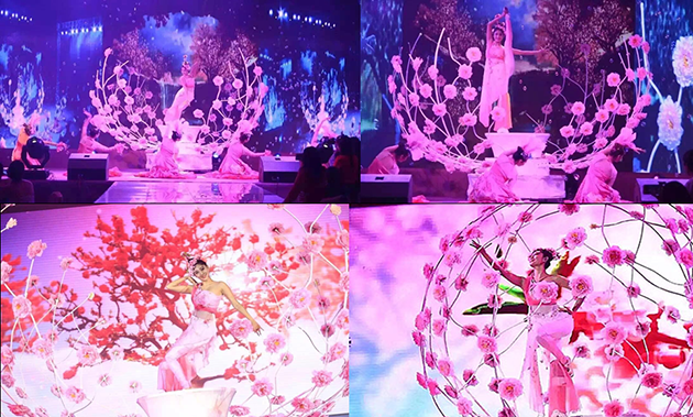 舞蹈《綻放》,利用視頻制作出花的世界,形式新穎,美輪美奐,演員身在花叢中起舞,帶給觀眾很強(qiáng)的視覺(jué)沖擊力。