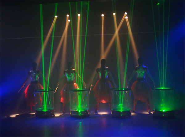舞者揮動手中神奇的鼓槌,炫彩激光光影伴隨著明快的節(jié)奏律動閃爍,像穿梭時空的迷離亦或是漂浮于未來世界的悸動。激光與打鼓表演藝術(shù)形式巧妙融合,每一次敲擊動作均配合著不同的激光光效效果以及舞者的曼妙姿態(tài),帶來視覺與聽覺的強烈沖擊。