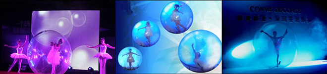 古典舞蹈與現(xiàn)代道具的完美結(jié)合,舞蹈演員用婀娜多姿的身軀跳著童話精靈一樣的舞蹈,極富觀賞價(jià)值。舞蹈演員在直徑2米的透明水晶球內(nèi),款款而舞,透過水晶球會(huì)隨著舞者的舞步慢慢滾動(dòng),配合現(xiàn)場(chǎng)的燈光效果,追光、七彩光、煙霧、泡泡,使得整個(gè)舞蹈唯美、浪漫、優(yōu)雅。